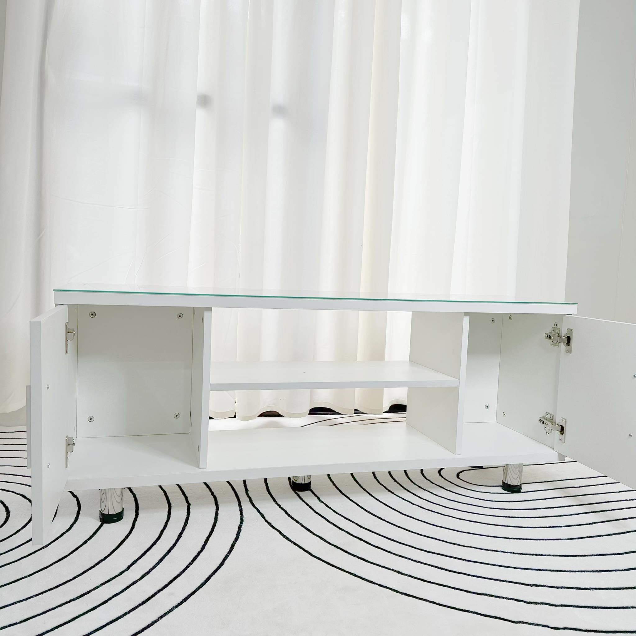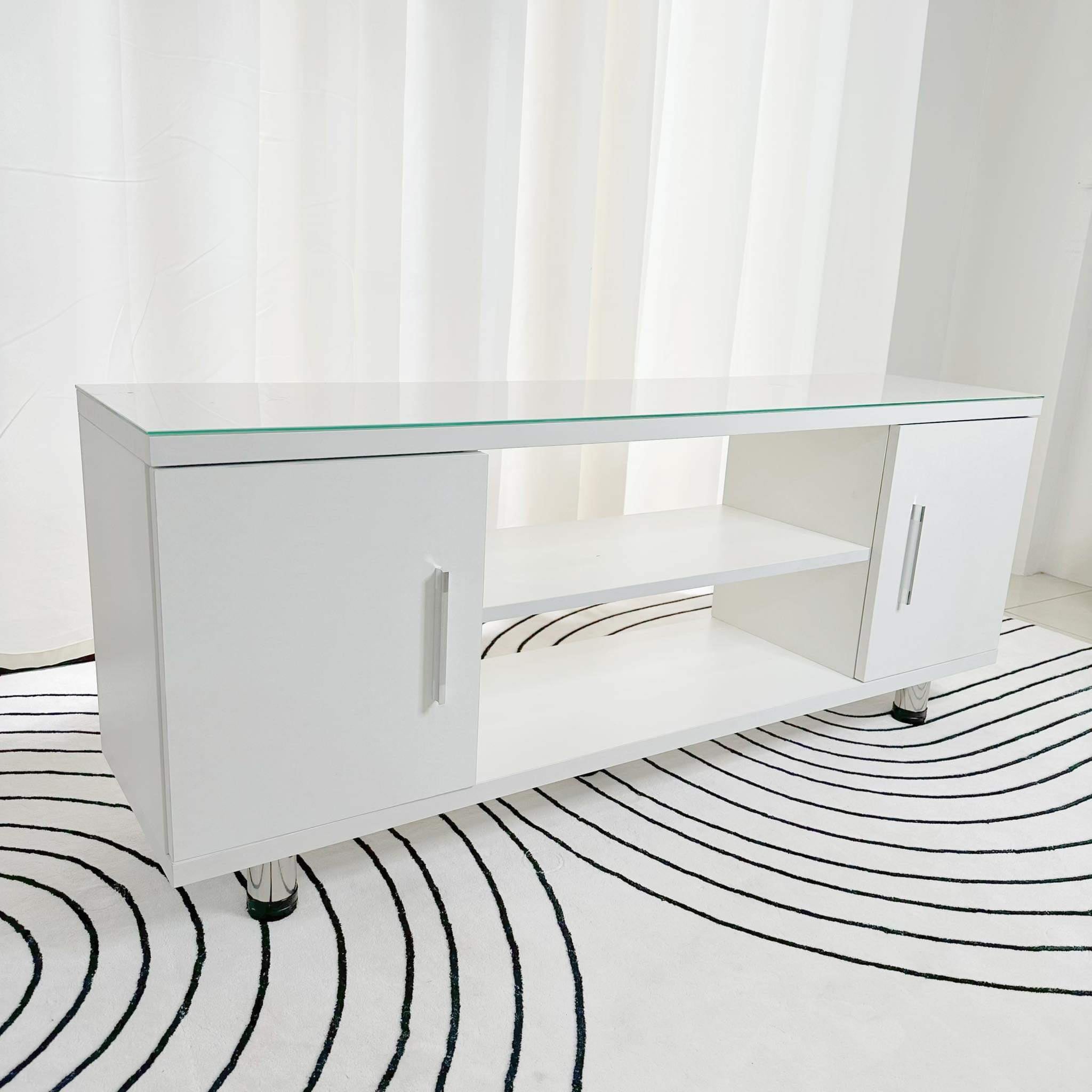 Crafted with a sleek and modern design, the Trixie white TV rack boasts a tempered glass top for added durability and style. Perfect for displaying your television and media devices, this rack is a must-have for any home entertainment setup. Transform your living space with this functional and elegant piece.